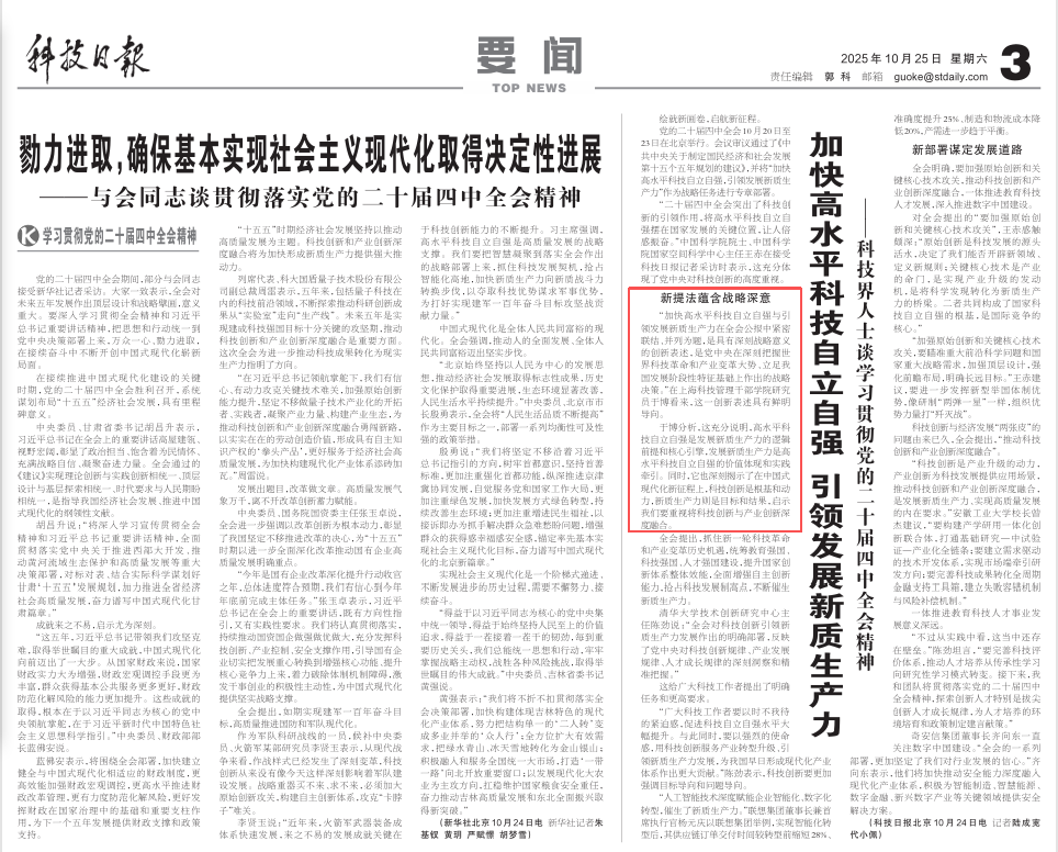 在科技日报10月25号文《加快高水平科技自立自强 引领发展新质生产力——科技界人士谈学习贯彻党的二十届四中全会精神》中,于博表示“二十届四中全会突出了科技创新的引领作用,将高水平科技自立自强摆在国家发展的关键位置,让人倍感振奋。”他指出,“党中央在深刻把握世界科技革命和产业变革大势、立足我国发展阶段性特征基础上作出的战略决策,具有鲜明导向。”这充分说明“高水平科技自立自强是发展新质生产力的逻辑前提和核心引擎,发展新质生产力是高水平科技自立自强的价值体现和实践牵引。”